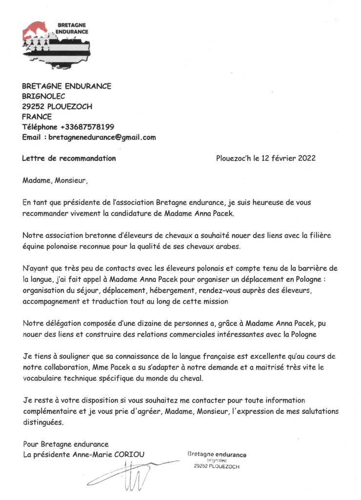 Je tiens à souligner que sa connaissance de la langue française est excellente qu’au cours de notre collaboration, Mme Pacek a su s’adapter à notre demande et a maitrisé très vite le vocabulaire technique spécifique du monde du cheval.