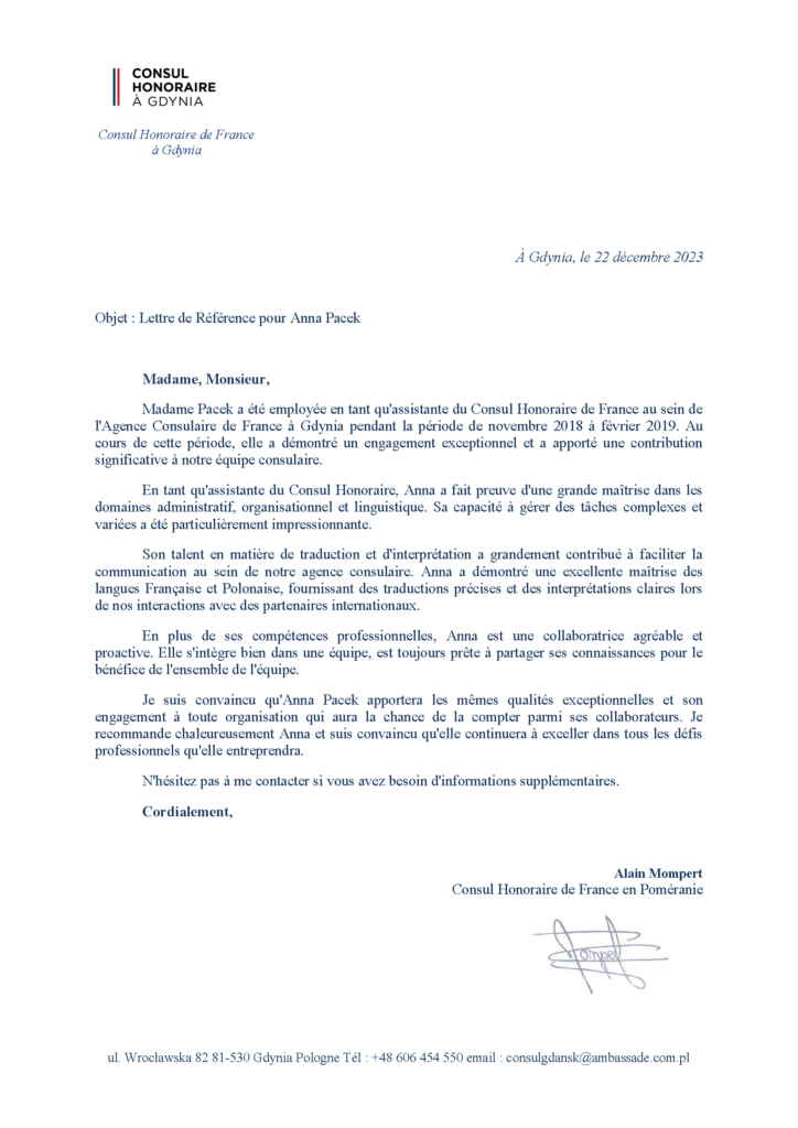 Madame Pacek a été employée en tant qu’assistante du Consul Honoraire de France au sein de l’Agence Consulaire de France à Gdynia pendant la période de novembre 2018 à février 2019. Au cours de cette période, elle a démontré un engagement exceptionnel et a apporté une contribution significative à notre équipe consulaire.
