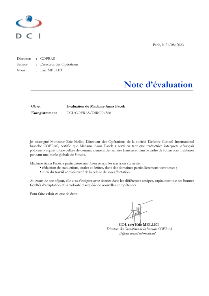 Je soussigné Monsieur Eric Mellet, Directeur des Opérations de la société Defense Conseil International branche COFRAS, certifie que Madame Anna Pacek a servi en tant que traductrice interprète « français polonais » auprès d’une cellule de commandement des armées françaises dans le cadre de formations militaires pendant une durée globale de 5 mois.
