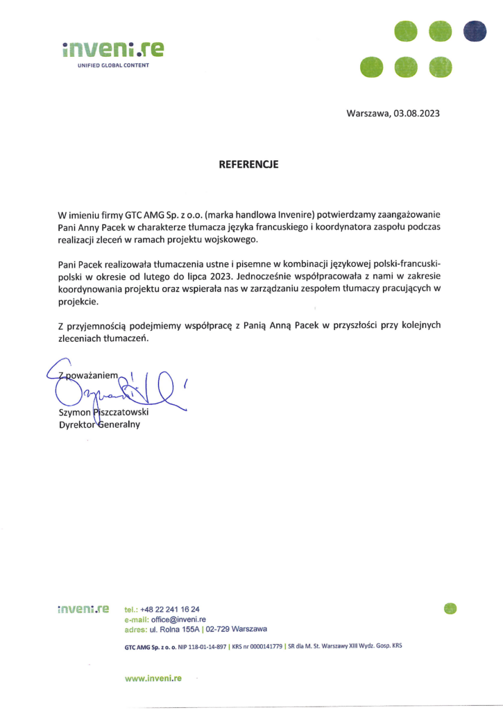 W imieniu firmy GTC AMG Sp. z 0.0. (marka handlowa Invenire) potwierdzamy zaangażowanie Pani Anny Pacek w charakterze tłumacza języka francuskiego i koordynatora zespołu podczas realizacji zleceń w ramach projektu wojskowego.