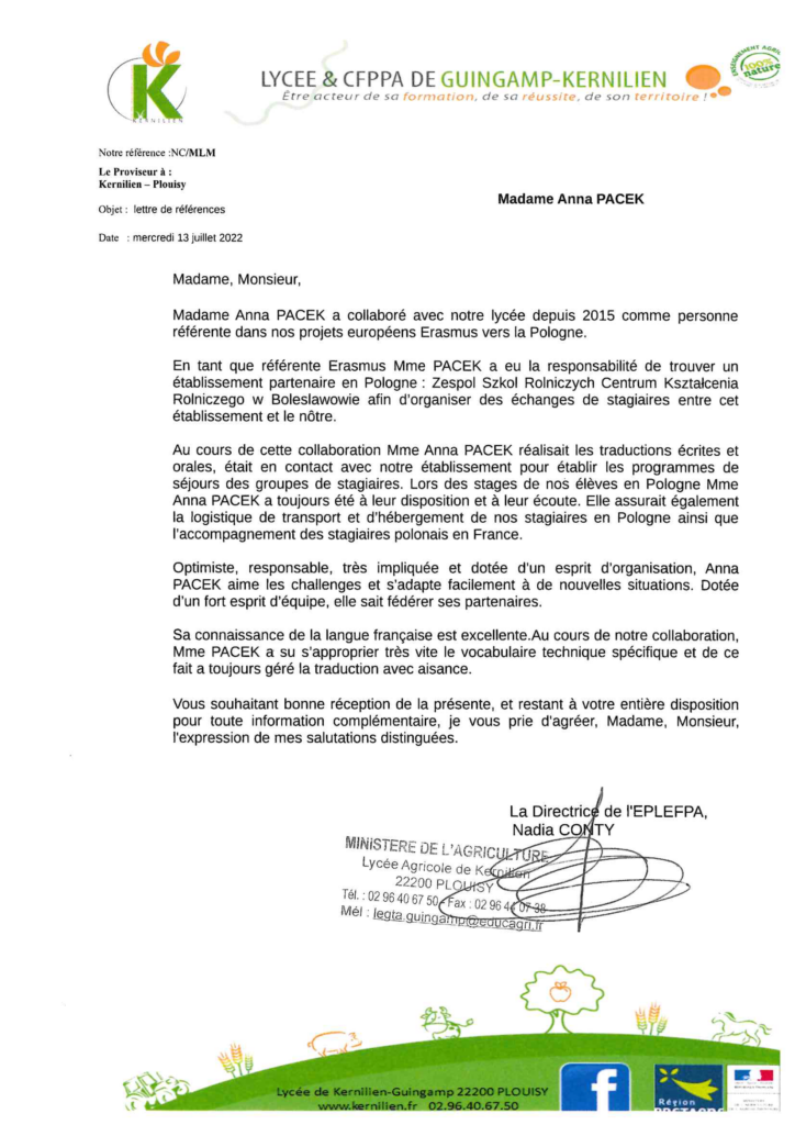En tant que référente Erasmus Mme PACEK a eu la responsabilité de trouver un établissement partenaire en Pologne : Zespol Szkol Rolniczych Centrum Ksztalcenia Rolniczego w Boleslawowie afin d’organiser des échanges de stagiaires entre cet établissement et le nôtre.